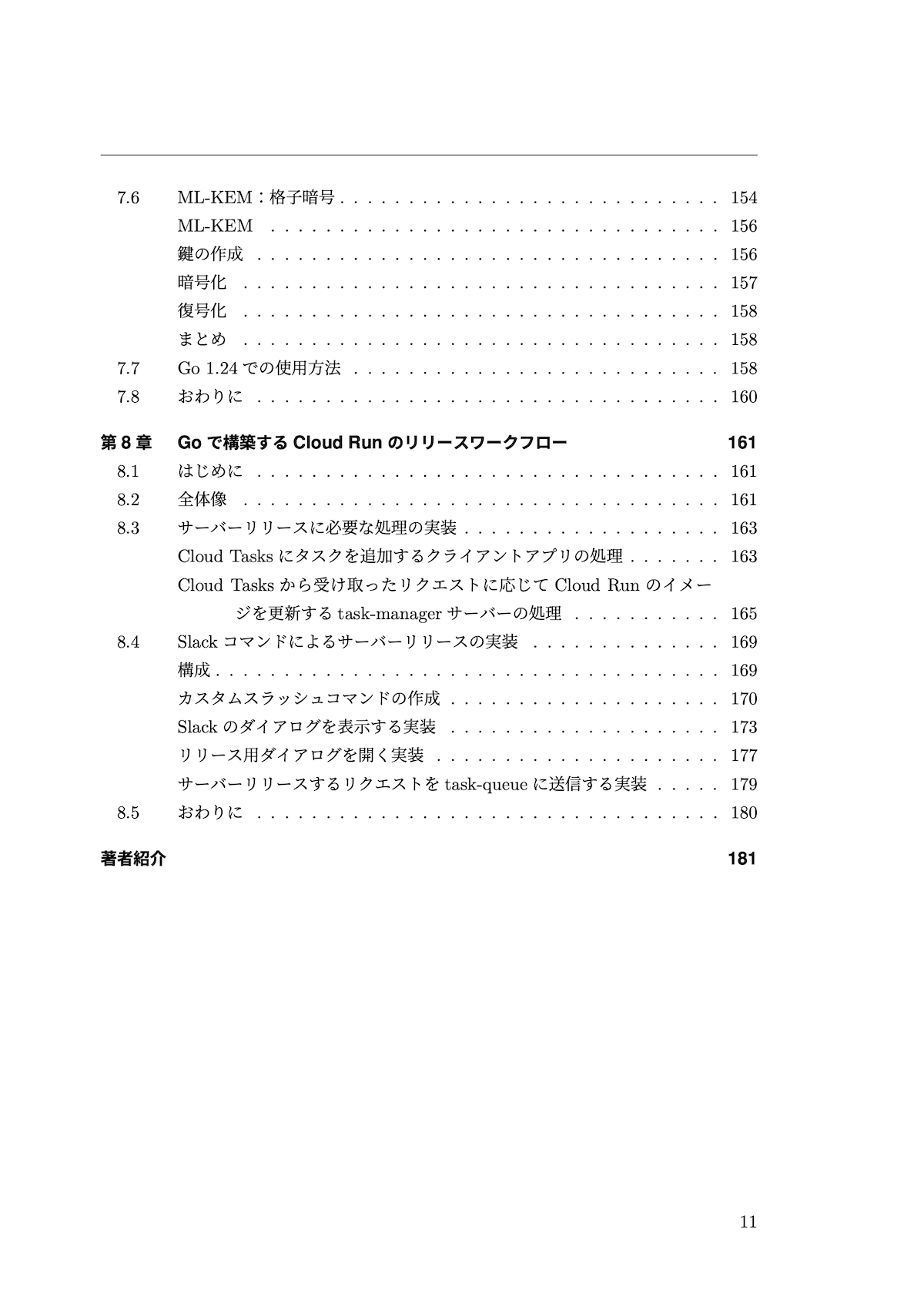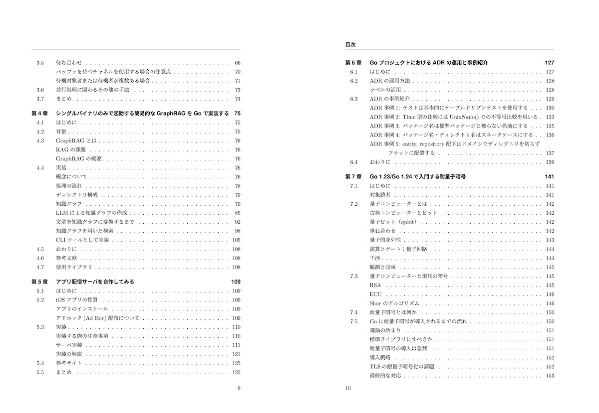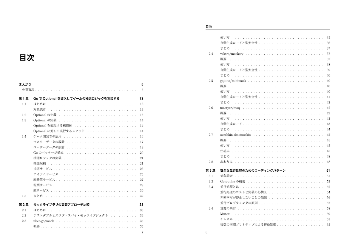 本技術書は、下記8章で構成されています。スマートフォンゲーム開発で実際に利用しているライブラリや実装手法の紹介から、Go標準機能の利用方法の解説まで、幅広い内容となっています。