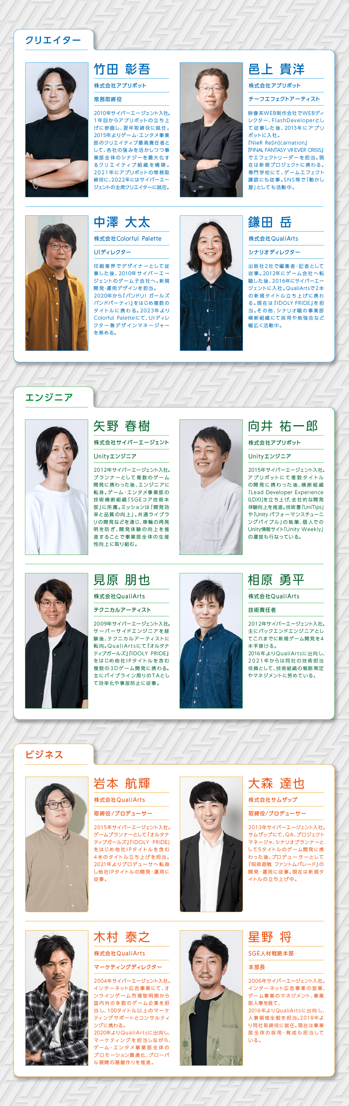 子会社制をとっており、各社が独自の強みを活かして開発を行う一方で、職種ごとのボードやワーキンググループといった横断組織を通じて、開発ノウハウや成功・失敗事例の共有・蓄積しています。「各社力」と「全社力」を活かして、ヒットタイトル創出の可能性を高めています。